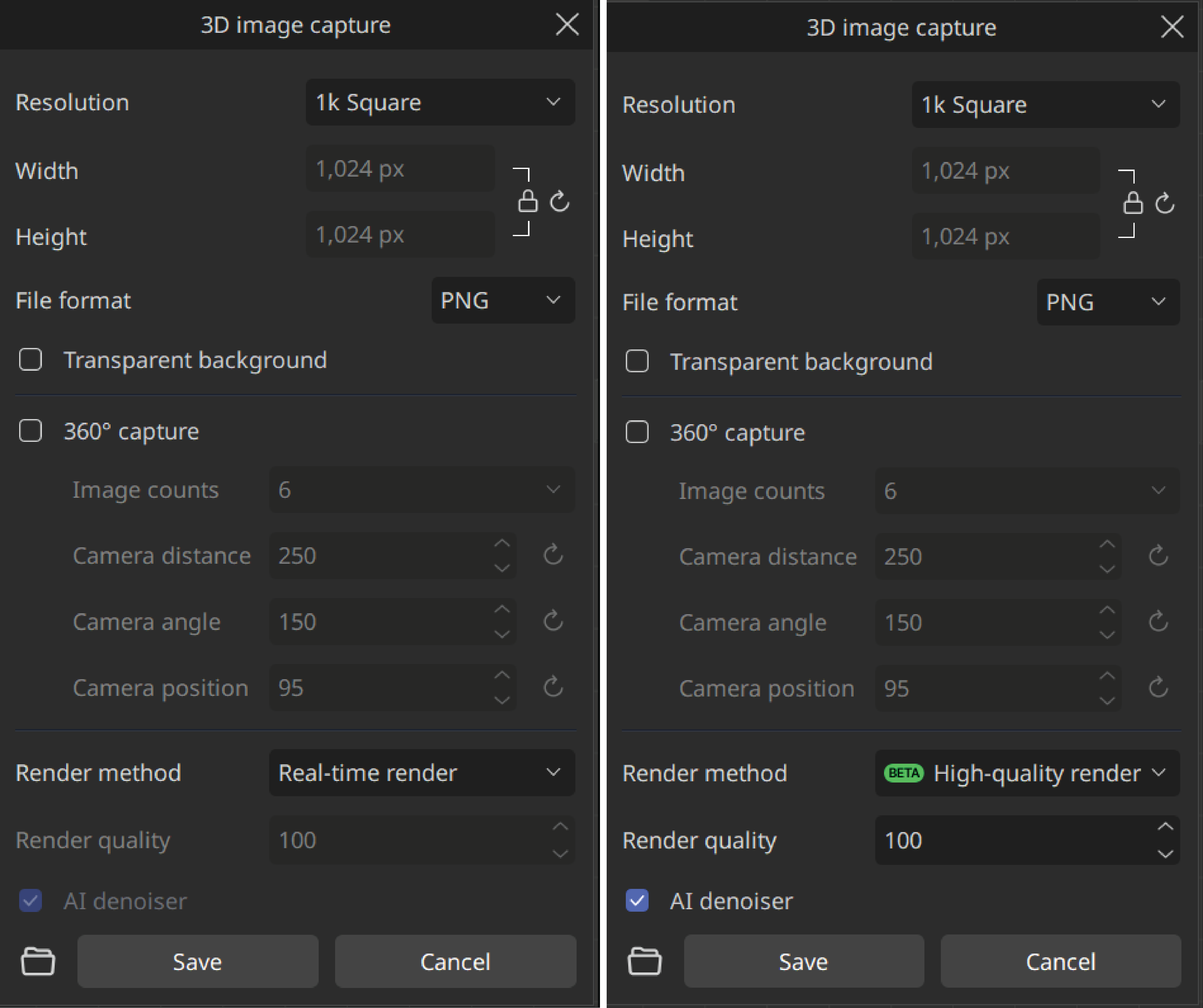 This option allows the user to export a 3D capture image with an AI denoiser, producing a cleaner image with less noise.