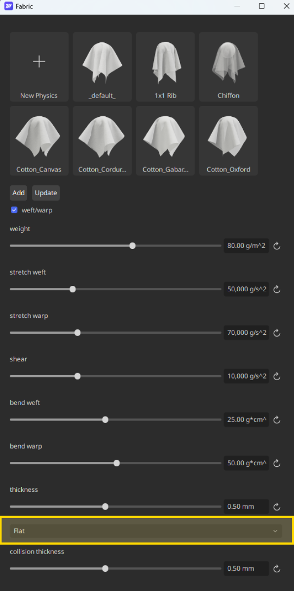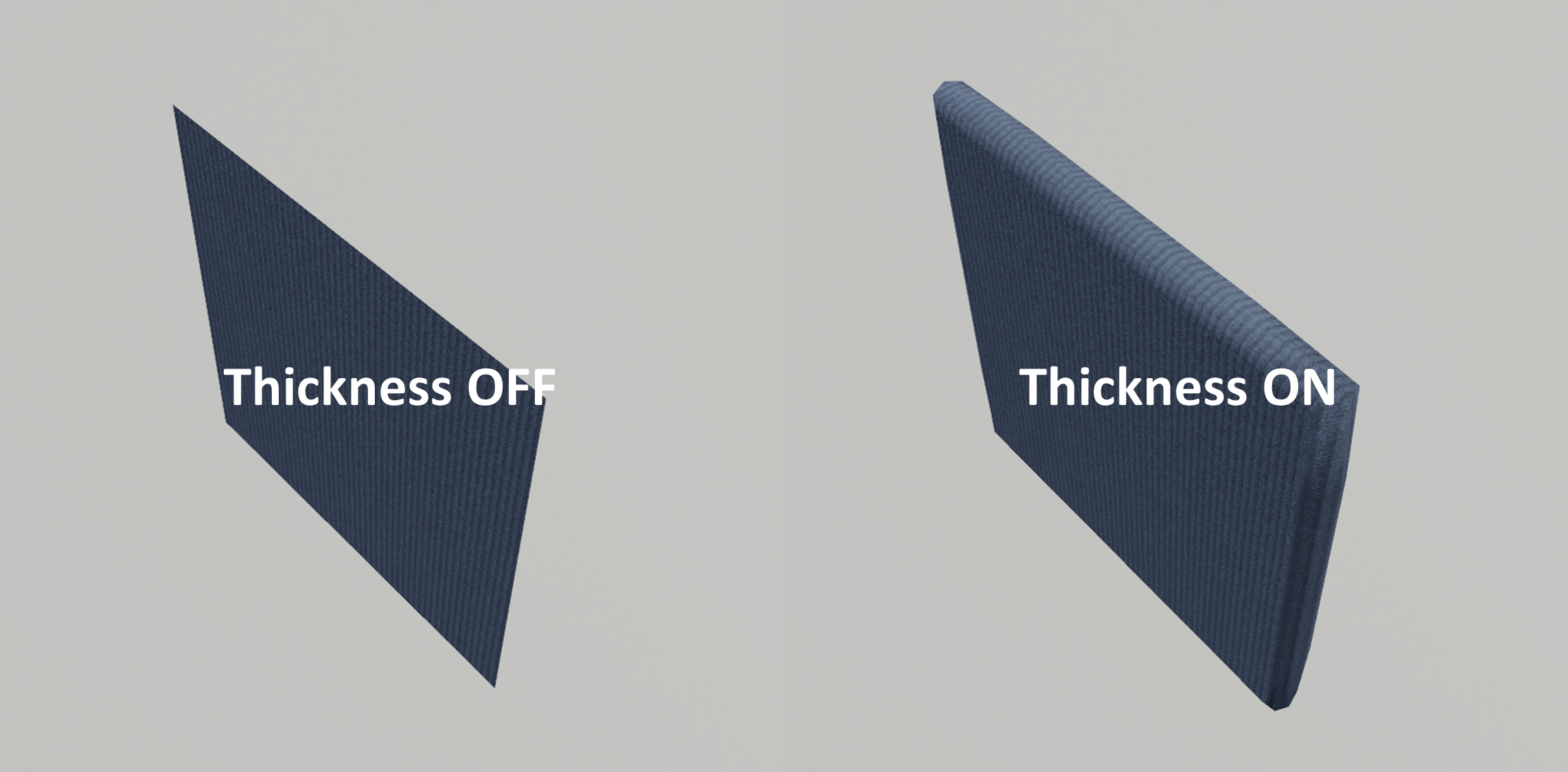 Pattern thickness type can be set via UI Panel > Fabric > Physical Properties.