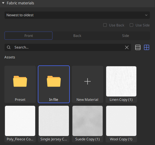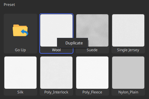 - Select a fabric from the default asset folder, or right-click and duplicate it to edit.
